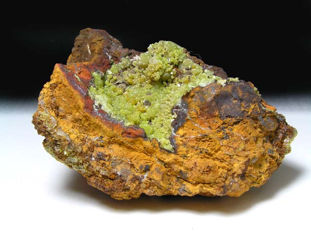 | ミメット鉱は、緑鉛鉱(Pb5(PO4)3,Cl)の燐(P)が砒素(As)に置き換わったもので、緑鉛鉱と同様に鉛鉱床の上部の酸化帯に出来る二次鉱物です。 緑鉛鉱の鉛(Pb)がカルシウムに置き換わると、燐灰石(アパタイト:Ca5(PO4)3Cl)なります。また、ミメット鉱や緑鉛鉱の砒素や燐が、バナジウムに置き換わるとバナジン鉛鉱(Pb5(VO4)3,Cl)になります。 このように、燐灰石、緑鉛鉱、バナジン鉛鉱、ミメット鉱は、よく似た化学組成と結晶構造を示し、互いに置換して燐灰石グループを形成しています。 燐灰石グループの鉱物は、綺麗な色調と形状を呈することが多く、ミメット鉱も、その一員として収集家に人気のある鉱物です。 英名は、ギリシア語のminetes(模倣、偽物)に由来します。これは、緑鉛鉱に似ているためと言われますが、すこし可哀相な気がします。和名は黄鉛鉱ですが、あまり使われません |